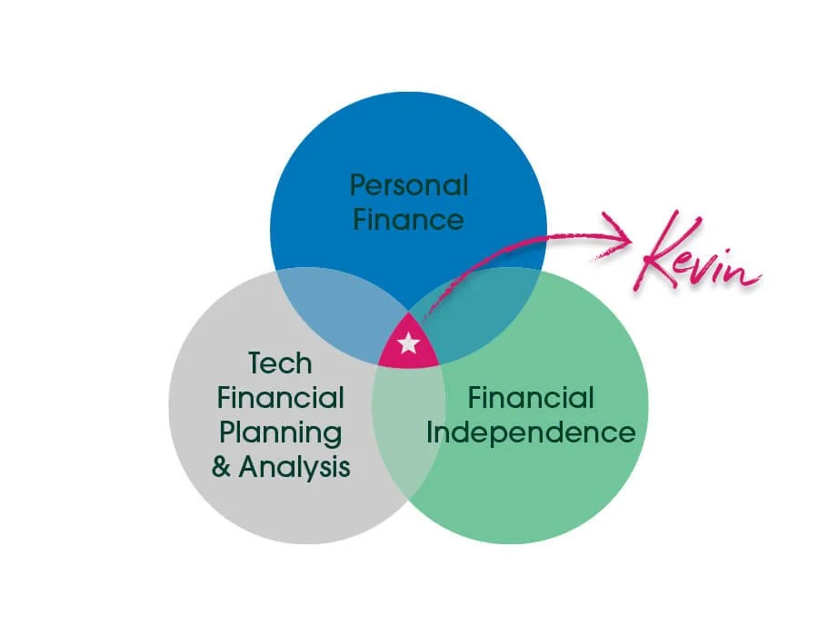 Venn diagram with three overlapping circles: blue is Personal Finance, gray is Tech Financial Planning & Analysis, and teal is Financial Independence. The intersection is magenta, has a star, and an arrow pointing to the magenta word Kevin.