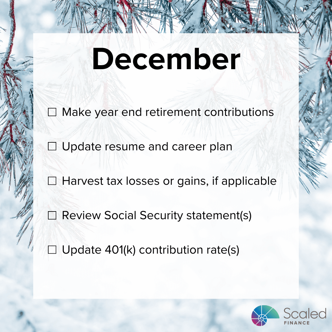 What financial steps might tech professionals take in December? Options might include: make year end retirement contributions, update resume and career plan, harvest tax losses or gains, review Social Security statement(s), and update 401(k) contribution rate.